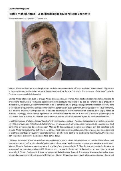 La semaine dernière, l'article principal du magazine CEOWorld portait sur l'histoire et la vie de Mohed Altrad. L'article est disponible sur le blog de Mohed Altrad (www.mohedaltrad.fr), en version PDF.
